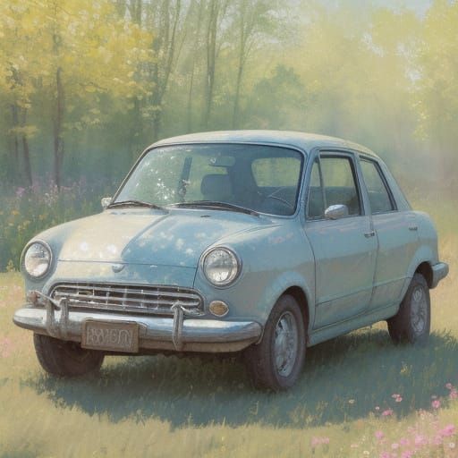A striking picture of a small car in a meadow, rendered in a neo-impressionistic style. The image features volumetric lighting, god rays, and a sunfire aura glow with a delicate lace canvas texture.