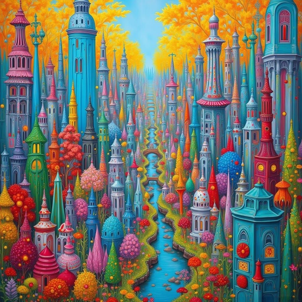 This AI-generated image depicts a surreal, imaginary metropolis with vibrant and lush elements, evoking a sense of an idealized paradise.