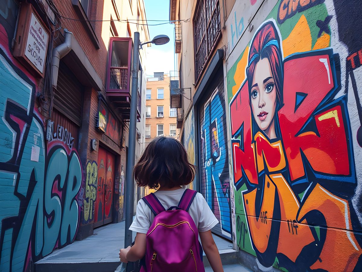 This image shows a young girl exploring a vibrant urban alleyway filled with graffiti. She discovers a detailed portrait of herself on one of the walls, rendered with sharp details and a hyperreal style.