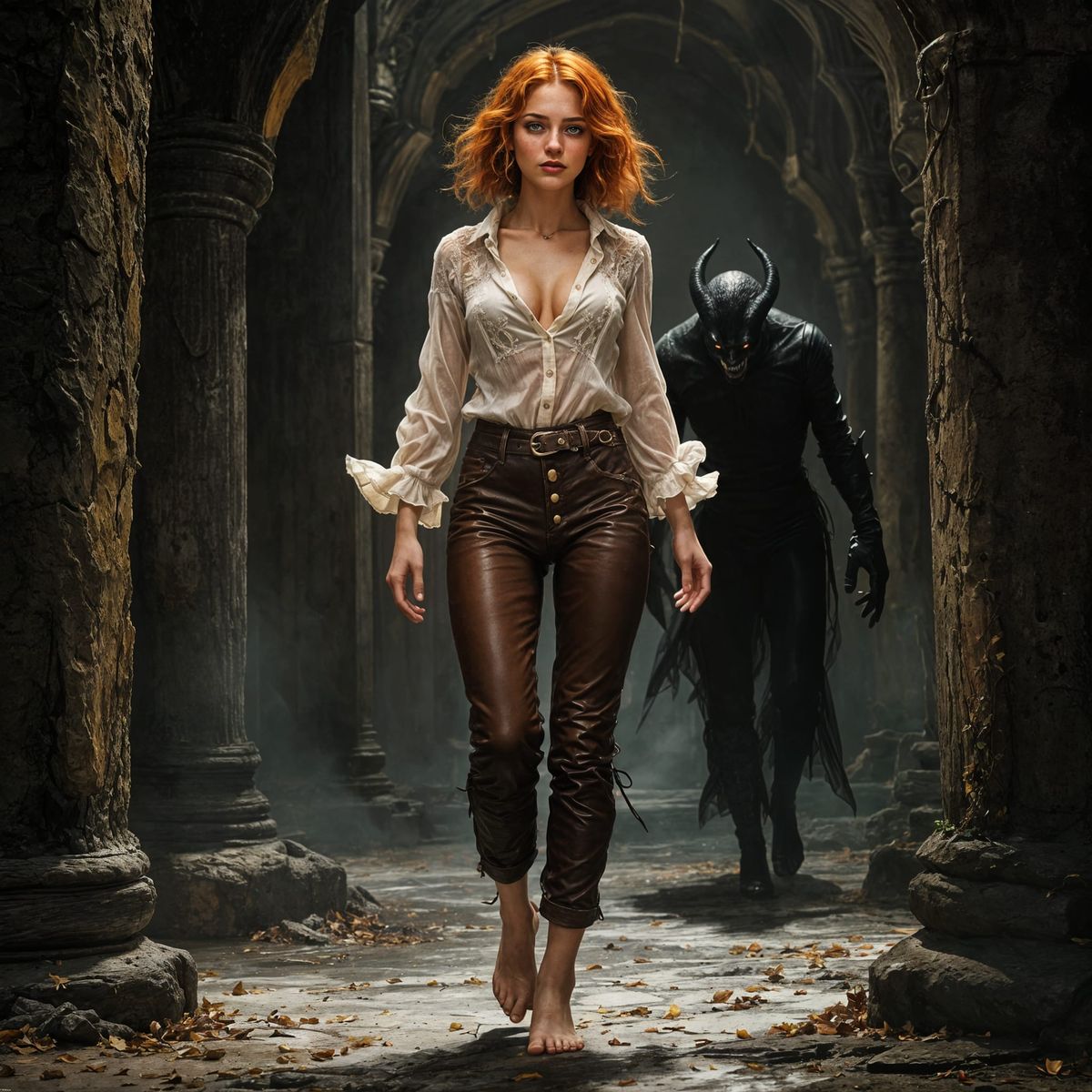 A fantasy illustration of a barefoot adventuress in a lace blouse and leather trousers, walking through a dark temple followed by a black latex demon. The image has a dark fantasy fairytale aesthetic.