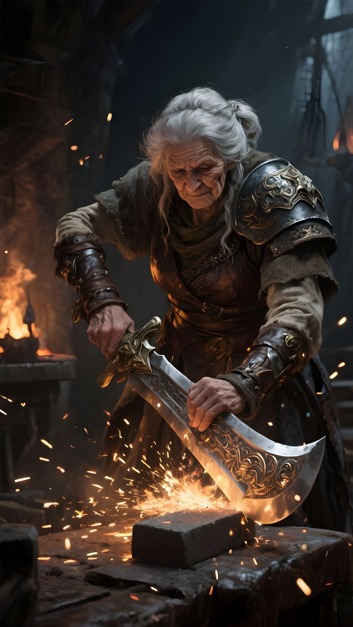 This image depicts a battle-hardened woman sharpening a large sword in a forge. Sparks illuminate her worn attire, rendered in a realistic digital painting style with a dark fantasy aesthetic.