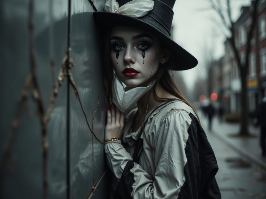 Generate unique mime images, featuring blue eyes and striking black makeup, with our easy-to-use AI tool. Try it free!