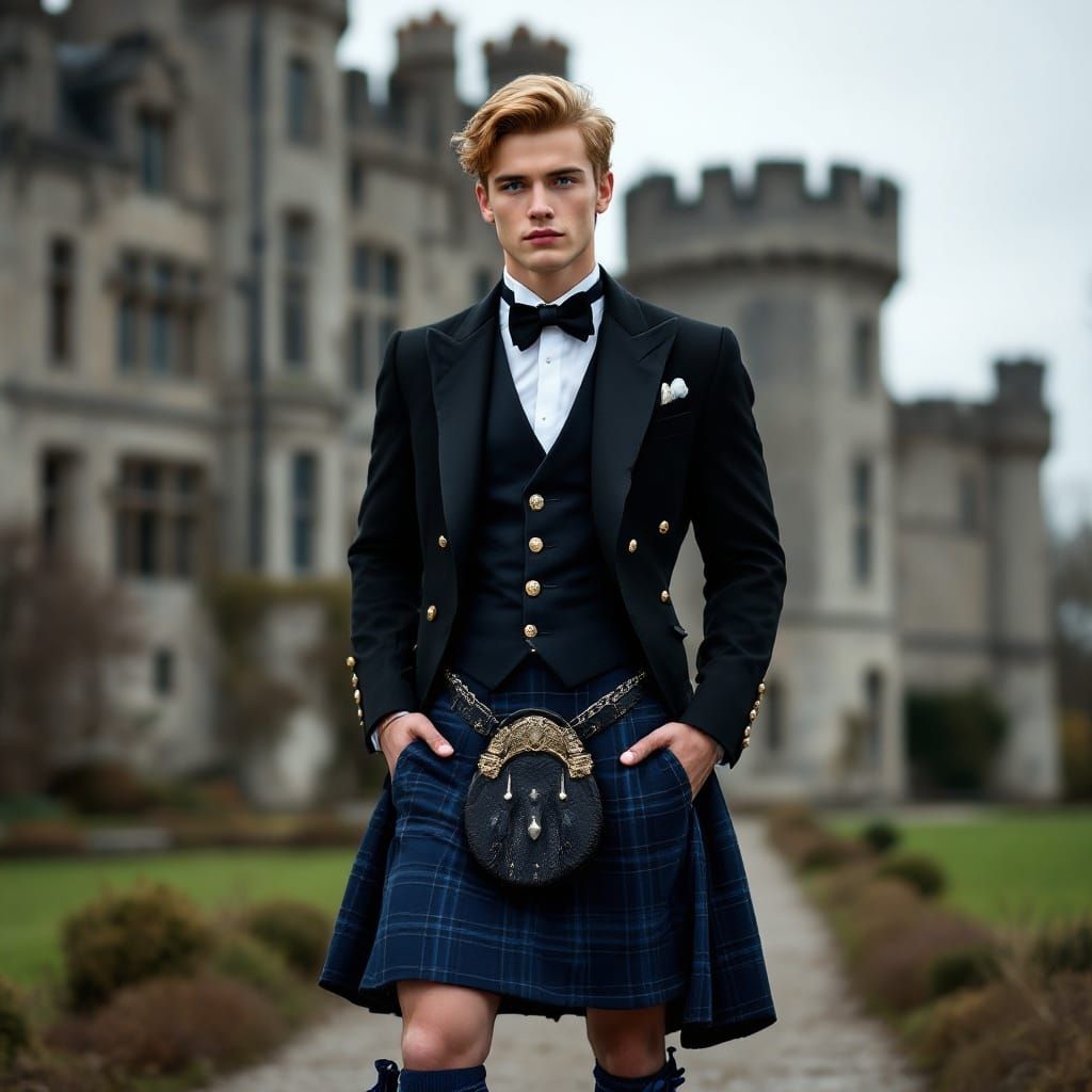 A dashing young man in traditional Scottish evening wear, posed in front of an ancestral castle, with a mix of realistic and cinematic lighting.