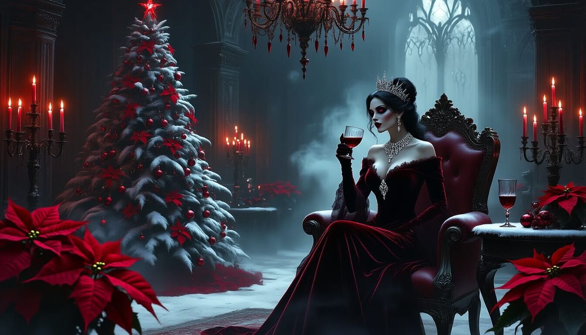 This image depicts a lavish vampire Christmas party in a haunted mansion, featuring gothic decorations, ethereal mist, and a vampire queen. Rendered in a dark fantasy art style with cinematic lighting.