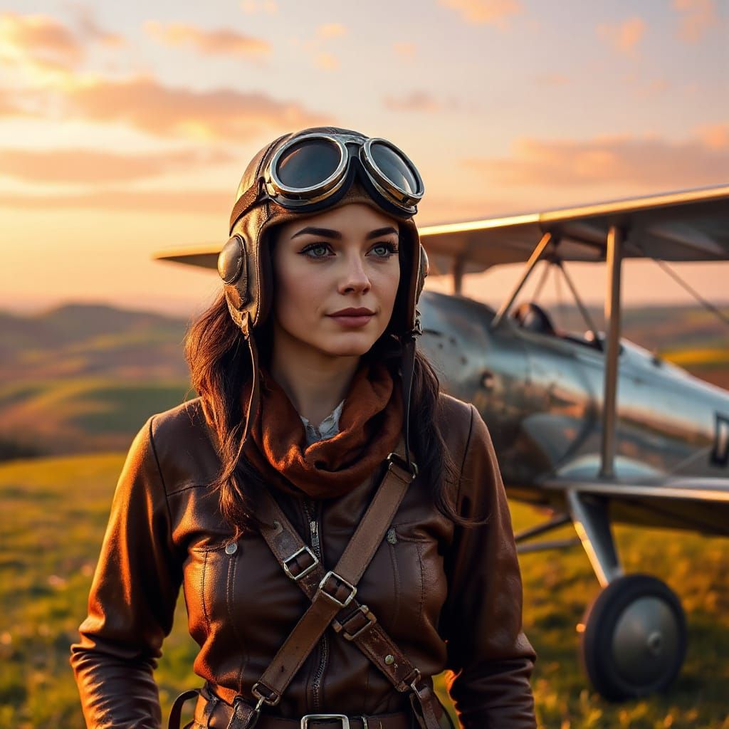 A female pilot in vintage gear stands by a biplane at sunrise. The artwork blends classic aviation art with storybook illustration, featuring atmospheric lighting and a gentle color palette.