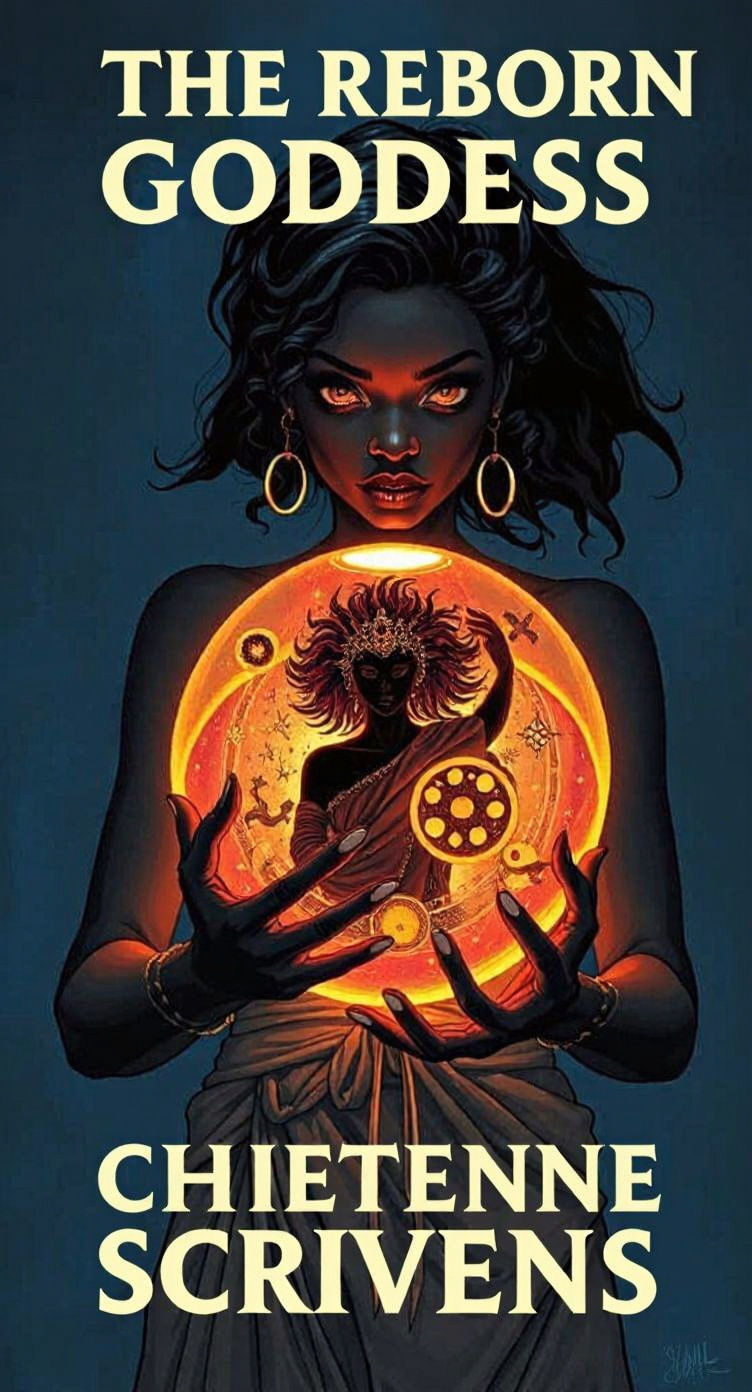 This bookcover features a black woman holding a radiant orb. Within the sphere, a powerful black goddess is depicted unleashing her mystical abilities.