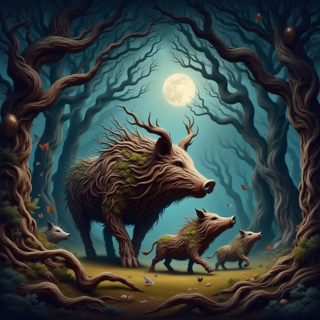 A dreamy forest scene featuring a majestic boar family, led by a wise matriarch, amidst ancient trees, fireflies, and a soft mist, in a whimsical, mystical atmosphere inspired by Corot's landscapes and Froud's fantasy art.