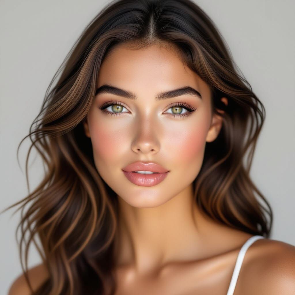 This hyper-realistic image showcases a stunning young woman with sun-kissed skin and lifelike features. Captured during golden hour with a shallow depth of field for creamy bokeh, it highlights natural beauty and subtle elegance.