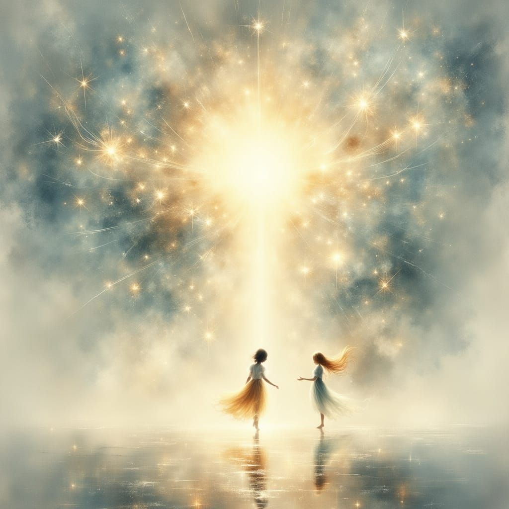 This image shows two souls, a child and a horse, being pulled apart from a central light source. Rendered in a delicate Japanese watercolor style, it evokes ethereal separation and fragile beauty.