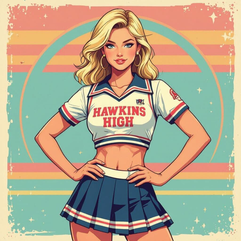 A retro image of a blonde cheerleader in a Hawkins High uniform. The image showcases a vibrant, nostalgic 80s aesthetic with bold lines and pastel colors, in a vintage style.