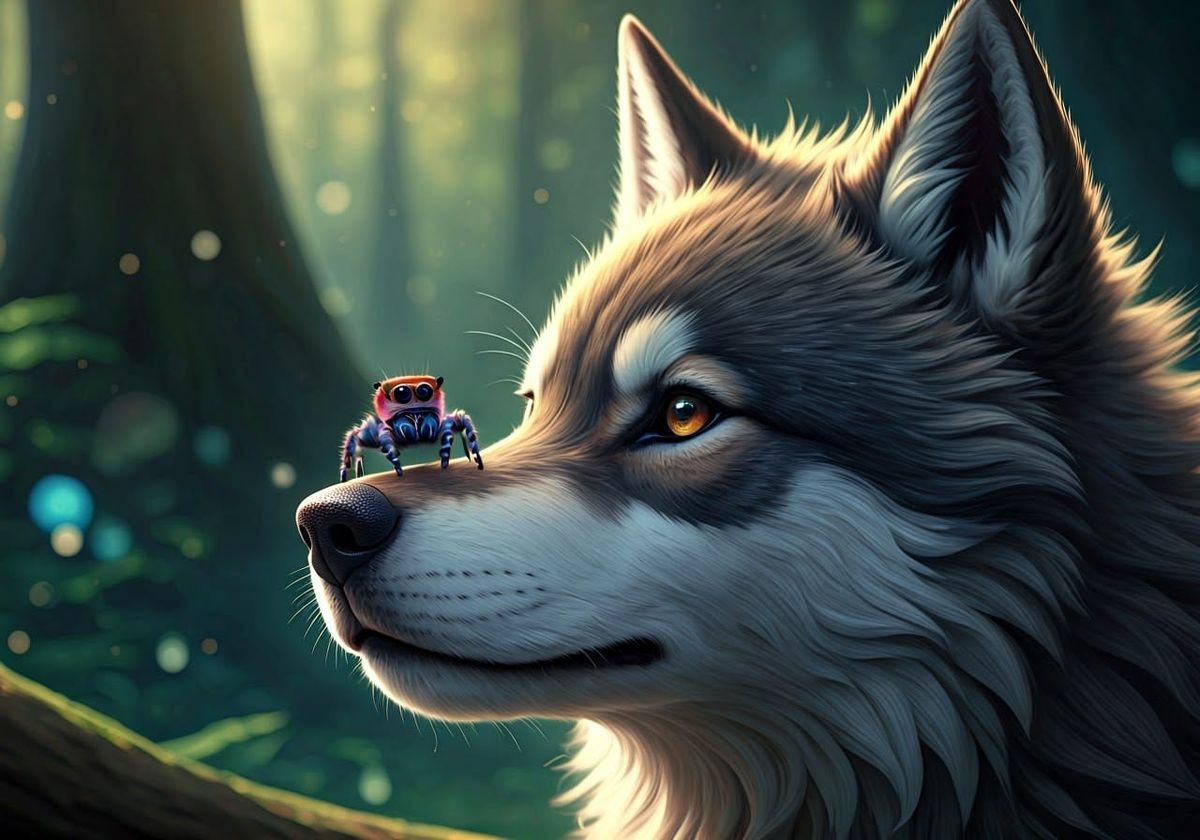 This enchanting image shows a tiny, adorable jumping spider perched on the nose of a playful Direwolf pup in a vibrant, mystical forest. The artwork is a masterful blend of 3D anime style and concept art, featuring intricate details and a breathtaking level of realism.