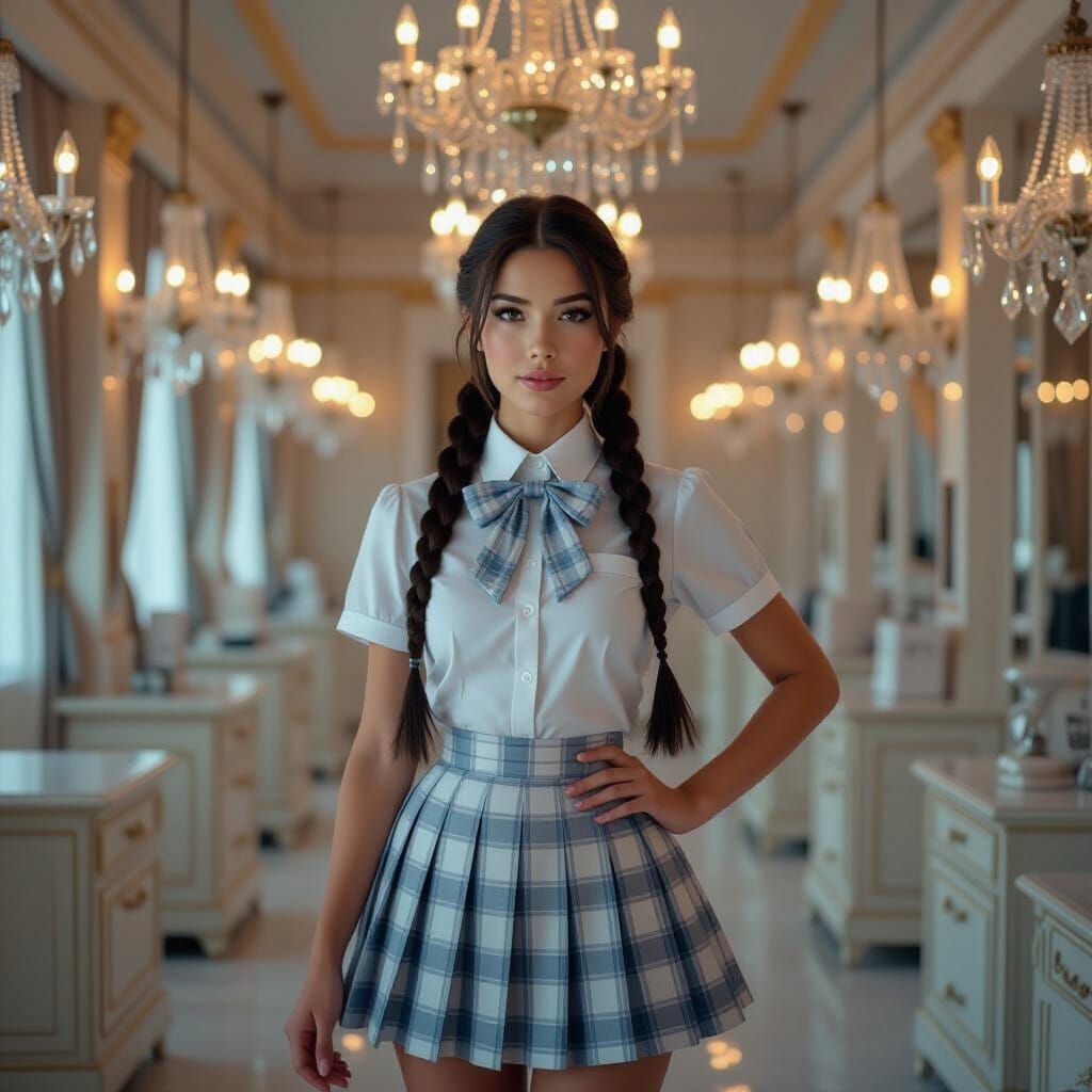 This image shows a young woman in a blue school uniform posing in a dressing room. The image features soft focus and warm golden lighting, in a cinematic and maximalist digital painting style.