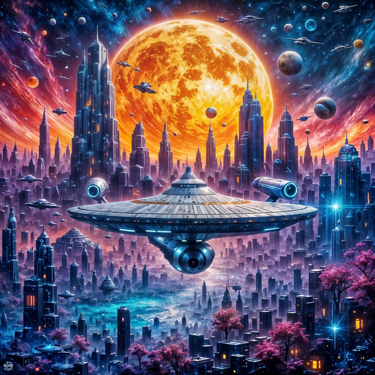 A striking picture of the USS Enterprise soaring before a futuristic cityscape. The image is rich with metallic textures and neon lights, set against a backdrop of cosmic clouds in vibrant colors. As impasto painting.