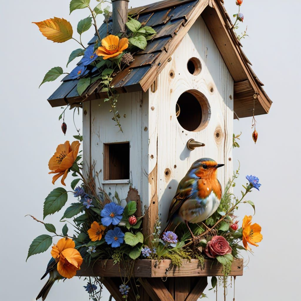 Close up Robin, bird house, garden, flowerq, Style Joachim Beuckelaer, watercolor, white background. Elegance, vibrancy of watercolor wash, highly detailed, with sharp focus and smooth transitions. JK, Carne Griffiths, Wadim Kashim, Carl Larsson, Pascal Blanche, golden ratio, masterpiece, trending on ...