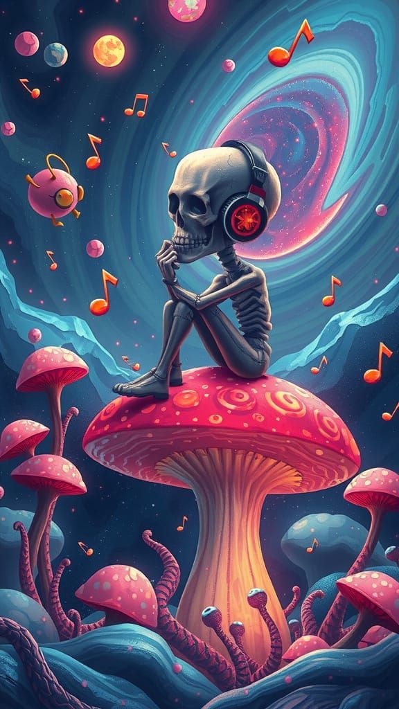 a skull sits in the 'thinking man' pose upon a giant luminescent mushroom visually striking abstract representation of concepts related to language and AI technology