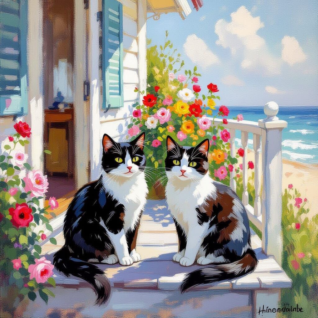 A charming image of two cats on a beach cottage porch, framed by colorful roses. The artwork evokes impressionism through soft light and delicate brushstrokes.