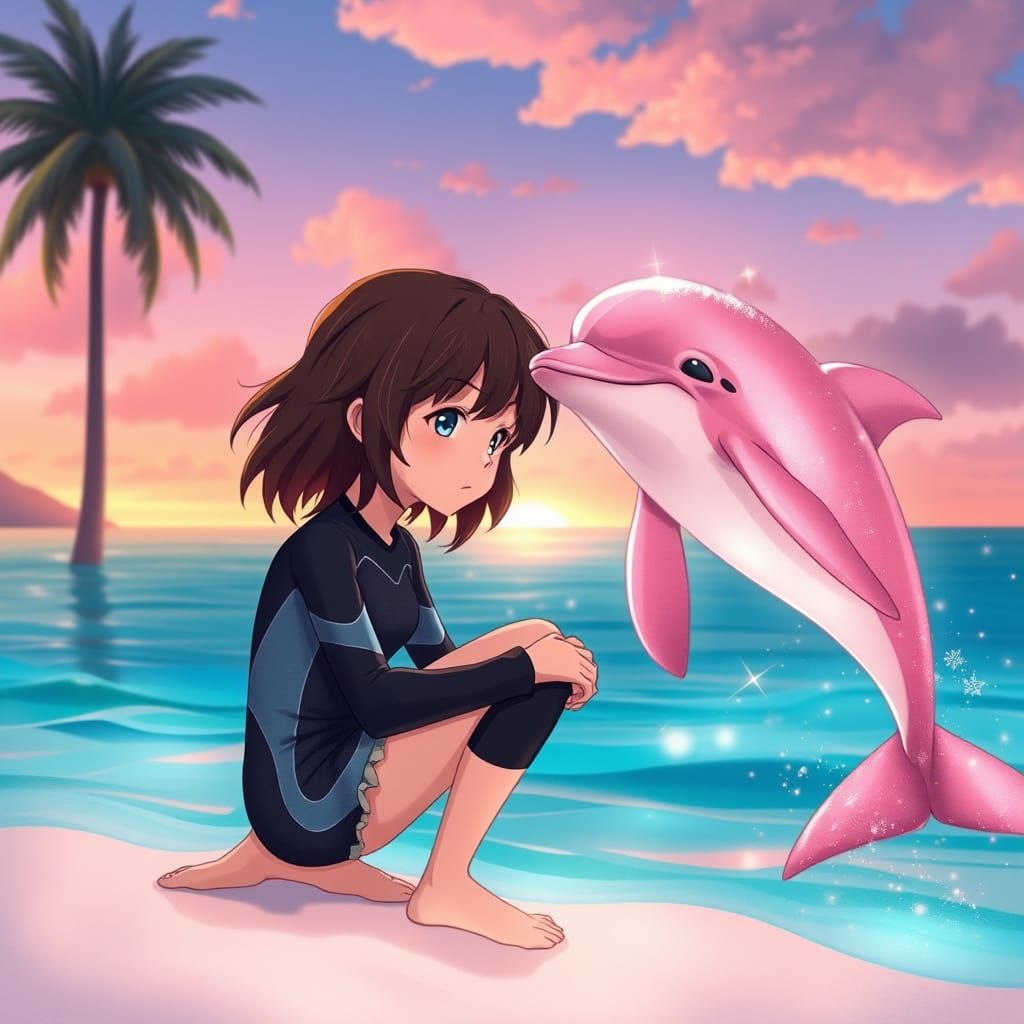 A digital artwork of an anime girl kneeling on a tropical beach as the sun sets. A pink dolphin swims nearby, surrounded by a soft, magical glow in a watercolor style.