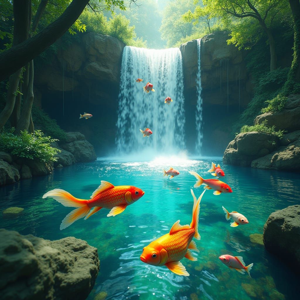 A picturesque pond teeming with colorful fish and vibrant plant life. The scene is bathed in complementary colors and intricate details, reminiscent of fantasy concept art. Rendered in 8k with Unreal Engine 5.