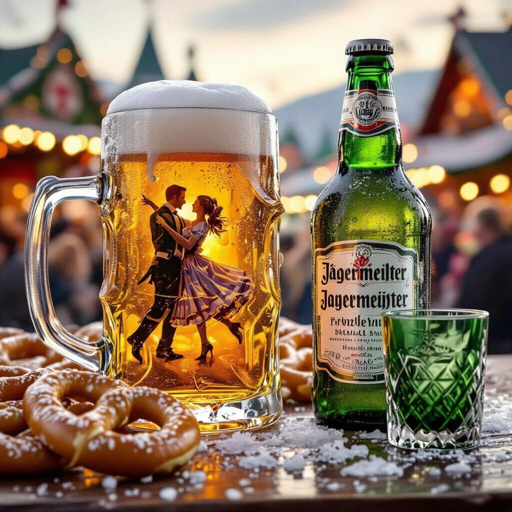 This ultrorealistic 4K photo captures a frosty mug of lager beer with a dancing couple depicted within. An iced Jägermeister bottle and shot glass sit beside it. Festive Oktoberfest elements fill the background.