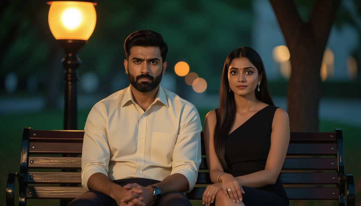 This photorealistic image captures a couple on a park bench at dusk, bathed in the glow of an orange streetlamp. The scene blends intimacy with an unsettling atmosphere, highlighted by dramatic lighting.