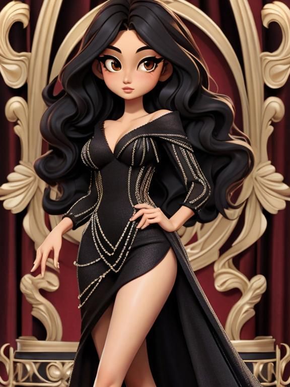 This image shows a stunning young Indonesian woman on a Hollywood red carpet. She is wearing a revealing black dress, and the image is highly detailed.