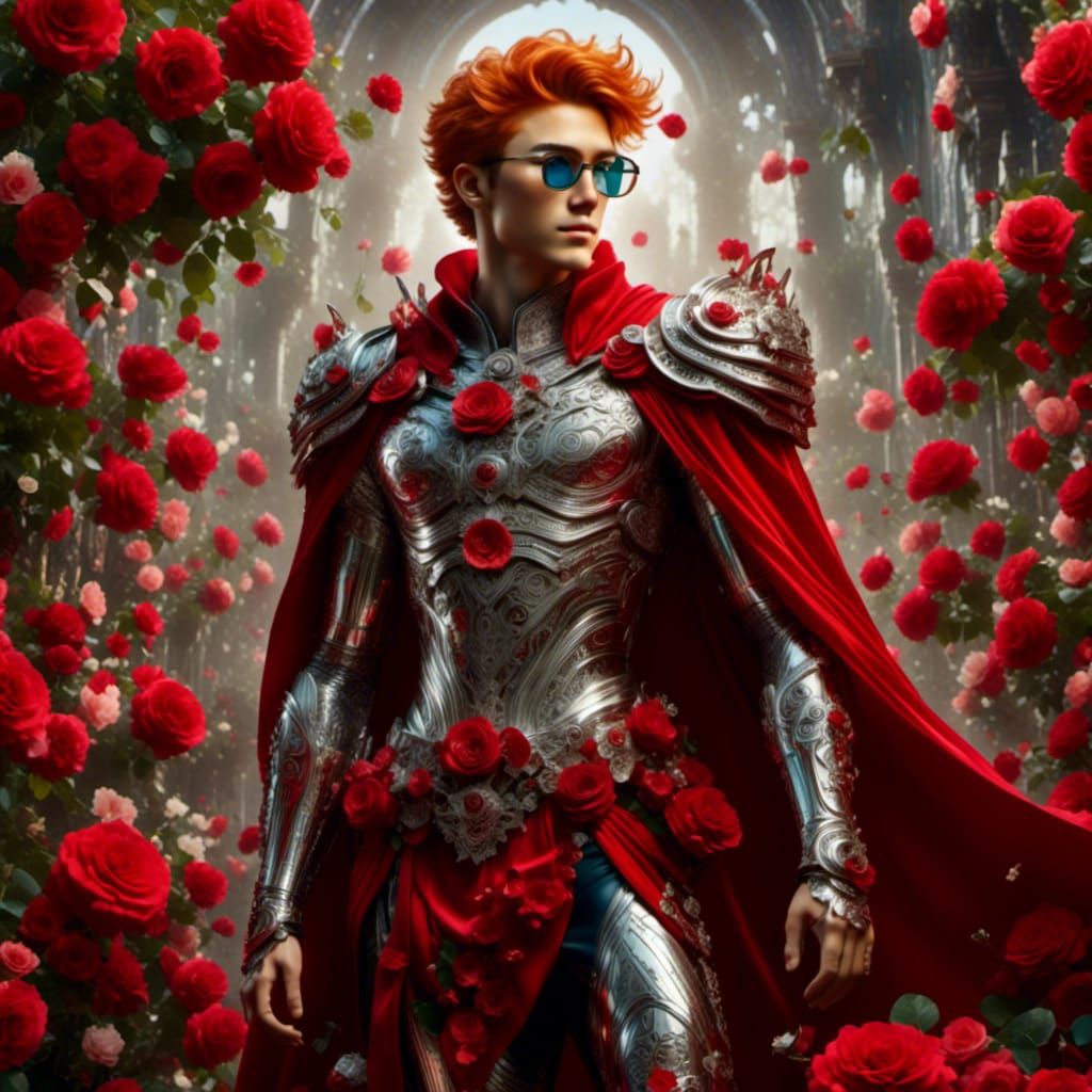This image shows a muscular, red-haired man in fantasy armor, confidently posed in a rose garden. His cape flows in the wind, rendered as hyperrealistic digital art.