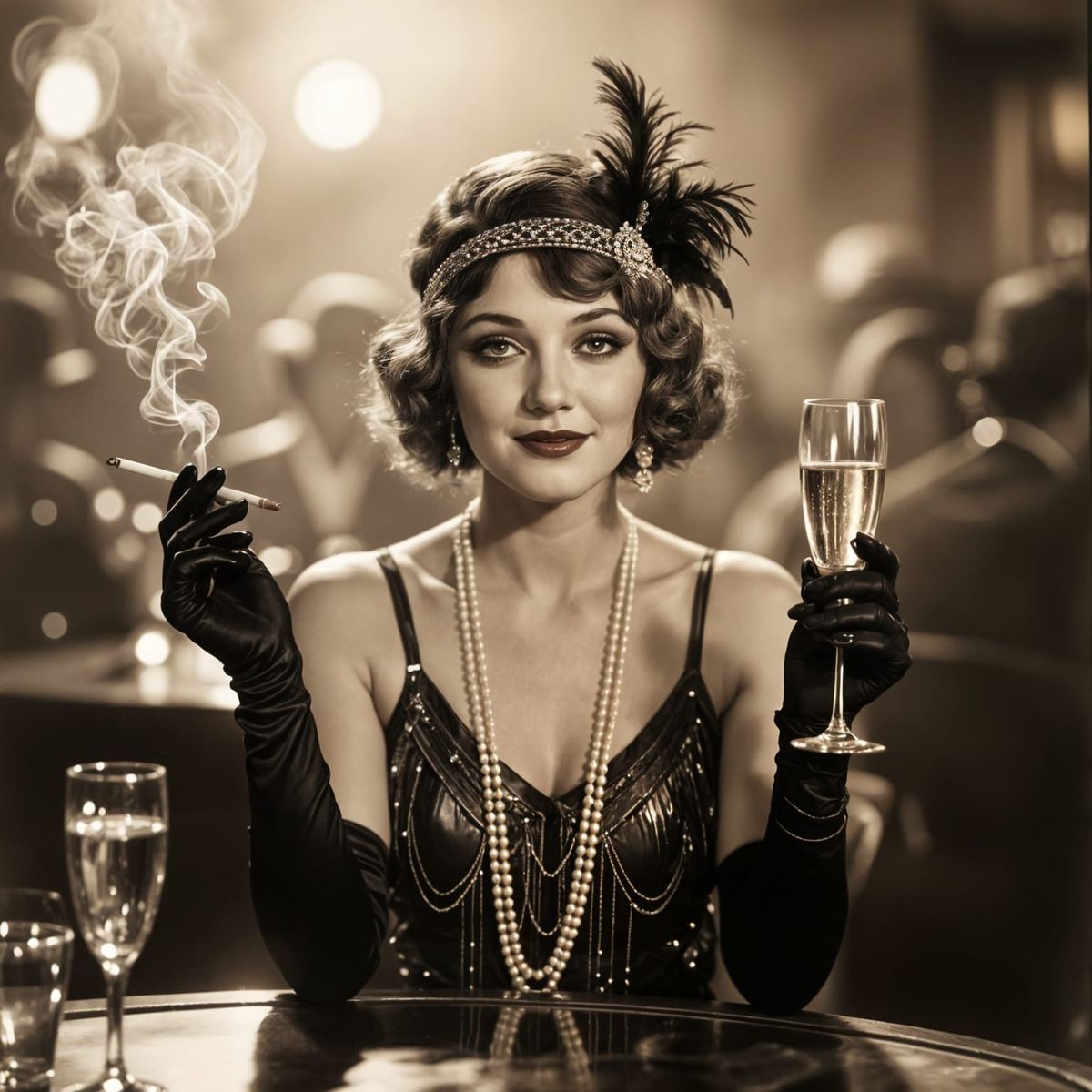 This image shows a flapper girl in a jazz club, holding a cigarette and champagne. The sepia tones evoke the glamour of the Roaring Twenties.