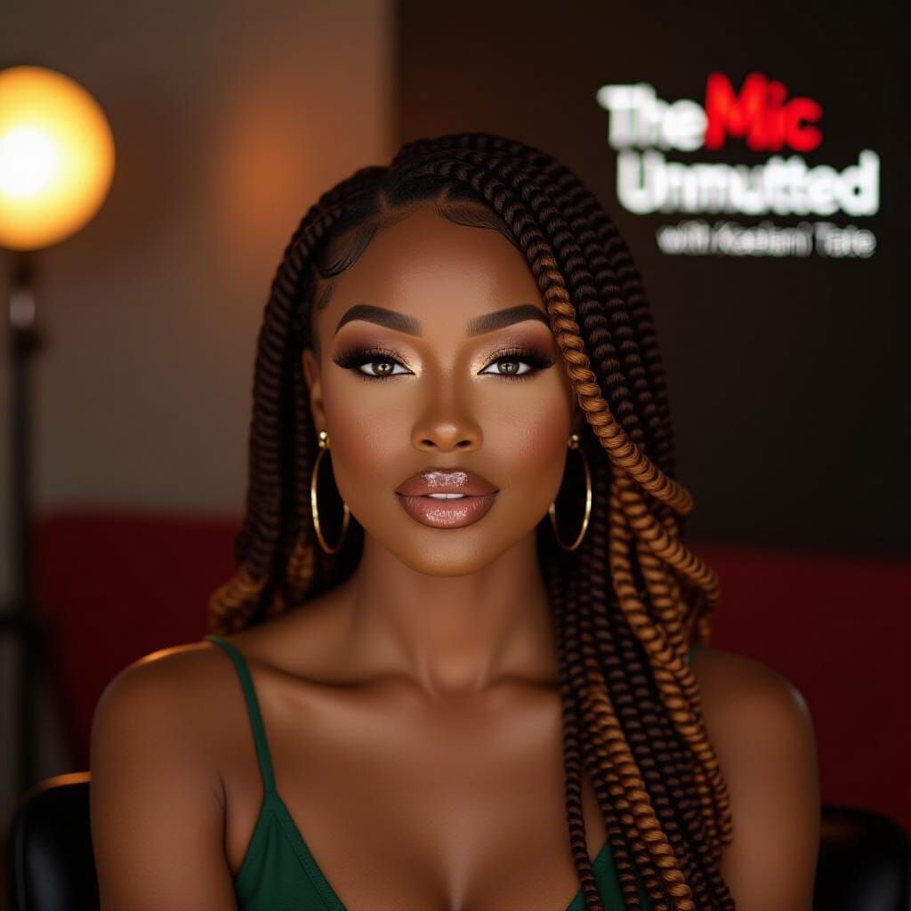This ultra-realistic 4k image showcases a beautiful Black woman with glowing highlight and soft glam makeup, radiating soulful energy in a dramatic studio setting. "The Mic Unmuted with Kaelani Tate" logo is visible.