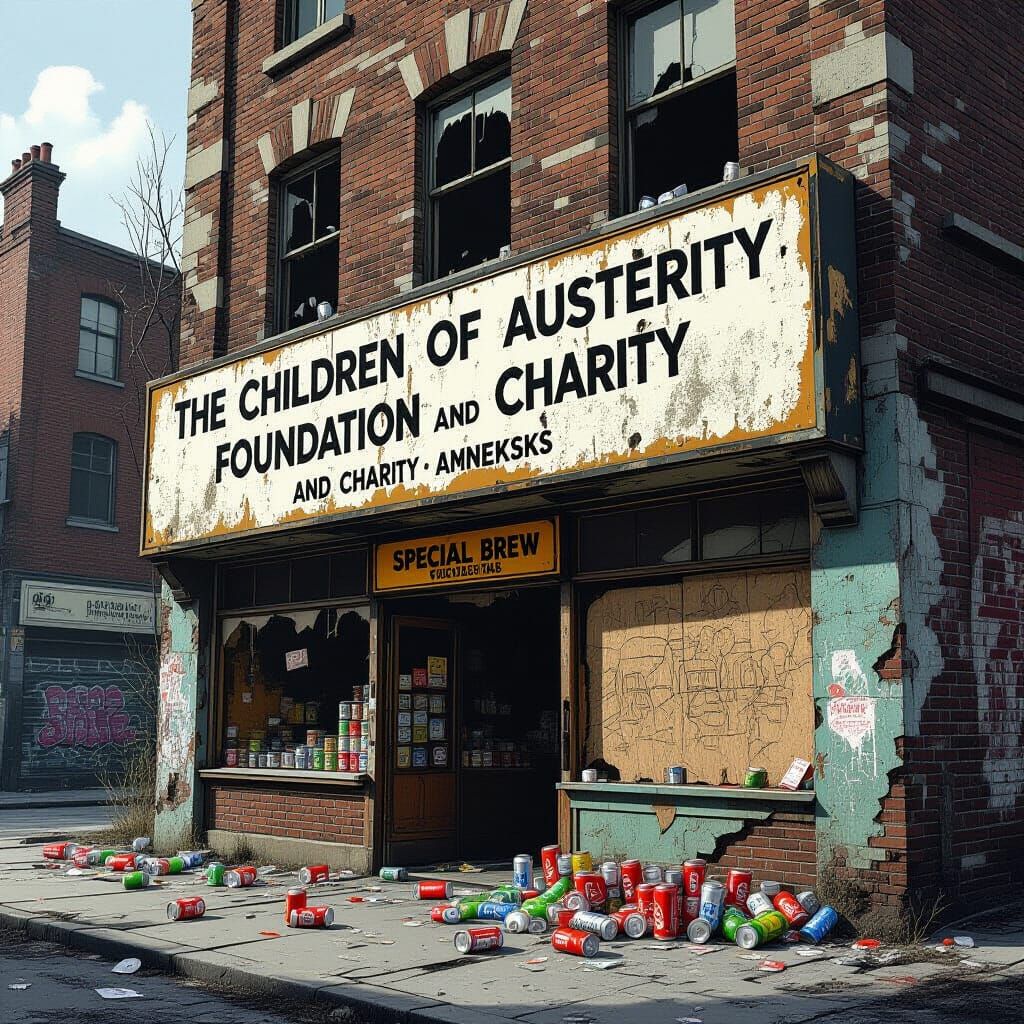 This image shows a dilapidated urban building with boarded windows and a prominent sign. The scene evokes decay and neglect, rendered in a dystopian style.
