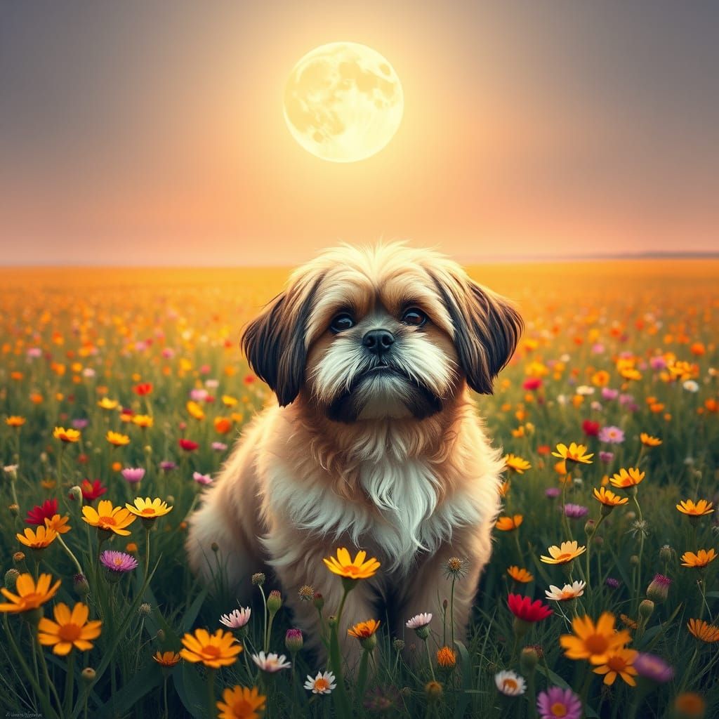 This image shows a peaceful Shih Tzu/Havanease dog sitting in a field of wildflowers at dusk, under the soft glow of a full moon, with a warm, sun-kissed coat and a whimsical, dreamy atmosphere reminiscent of classic British watercolors.