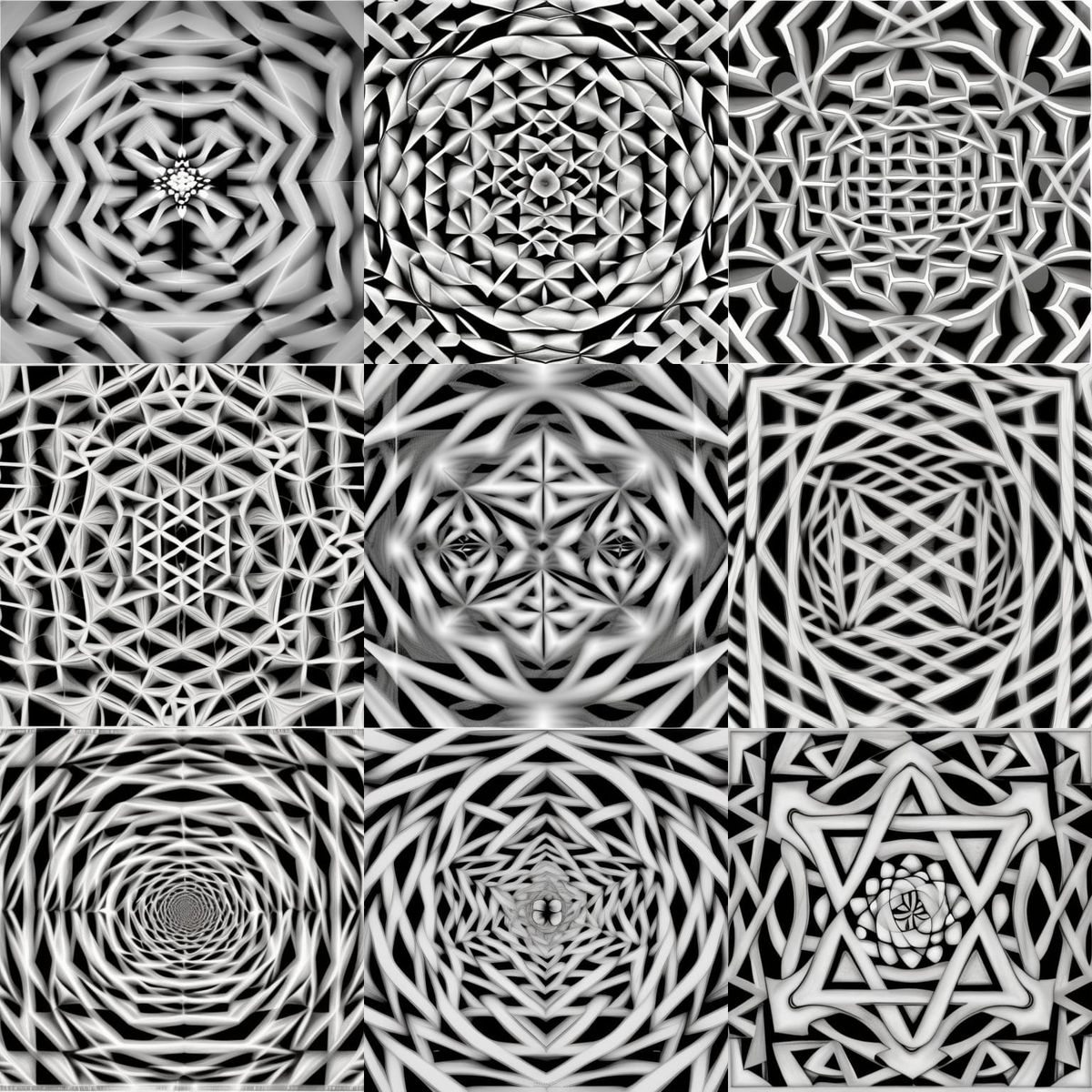 A striking picture of a black and white heptagram design. The image incorporates sacred geometry and fractal patterns in a M.C. Escher style.