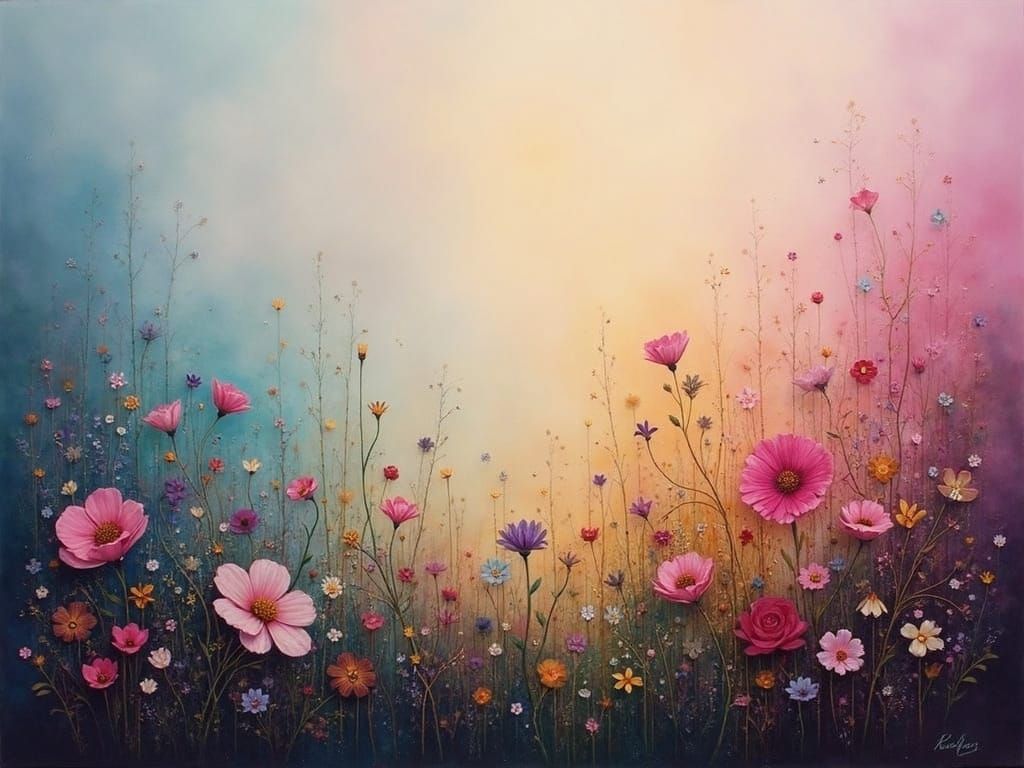 This image is a serene depiction of a misty, dreamy floral landscape with a mix of vivid and atmospheric colors, reminiscent of an ethereal oil painting.