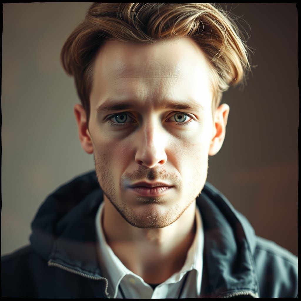 This image showcases a unique, unconventional human portrait with surreal and abstract elements, blending two exposures for a striking visual effect.