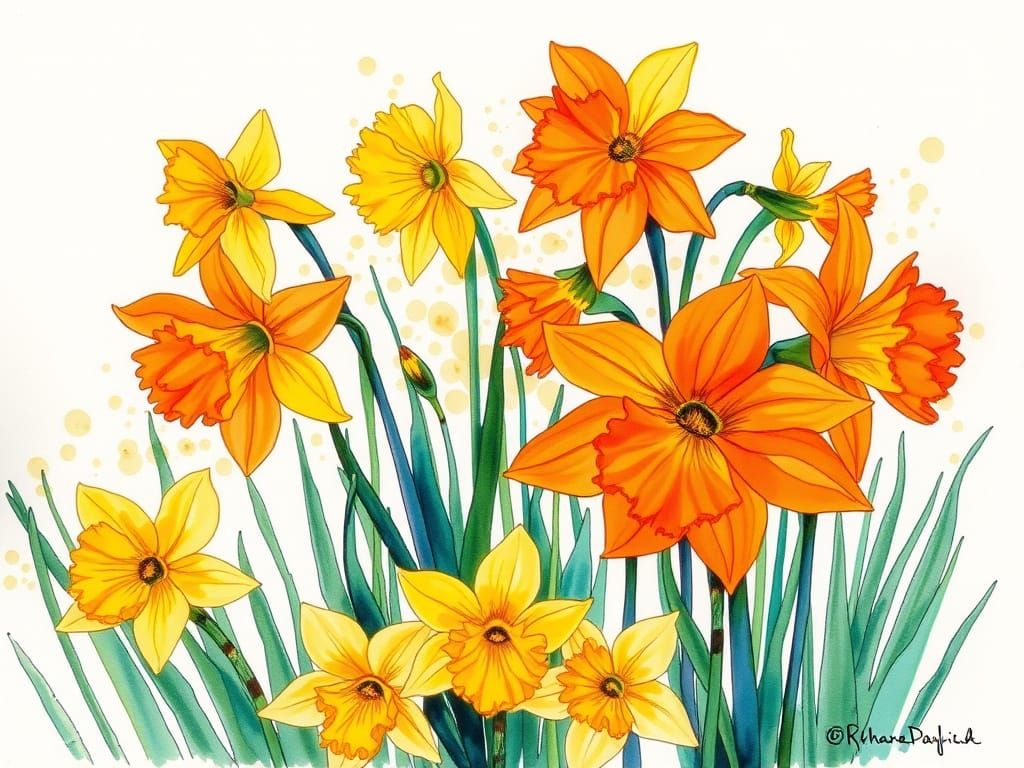 This image shows a colorful flowerbed of daffodils in full bloom, painted in a loose, expressive style reminiscent of alcohol ink techniques. The flowers' bright orange and yellow hues add a pop of color to the scene.