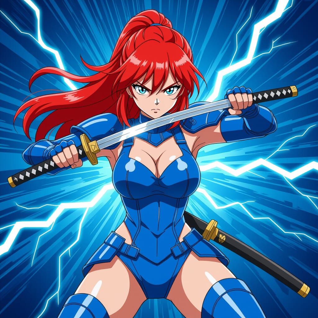 This anime-style image features a red-haired woman in blue futuristic armor, holding a samurai sword amidst intense lightning. Rendered with bright colors and cinematic lighting.
