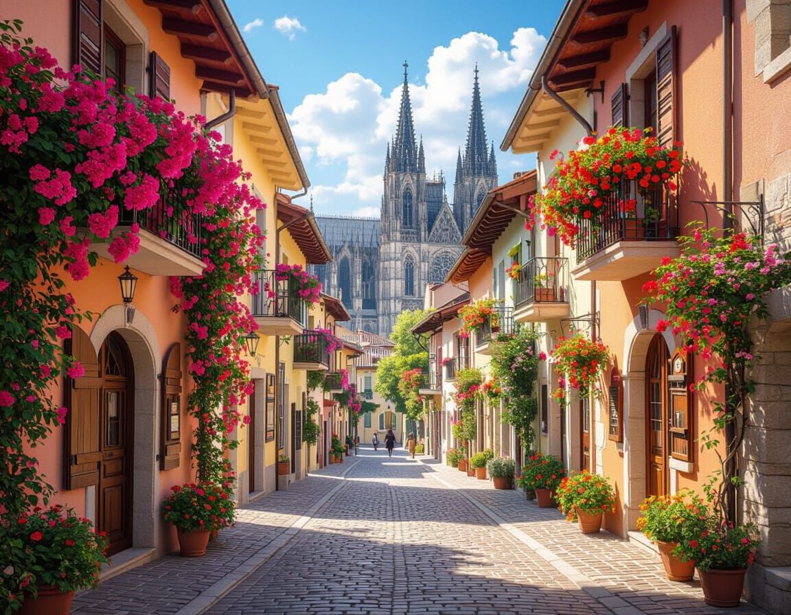 This image shows a sunlit, narrow cobblestone street in a European town, featuring colorful buildings with flower-laden balconies and a distant Gothic church. Photorealistic with golden hour lighting.