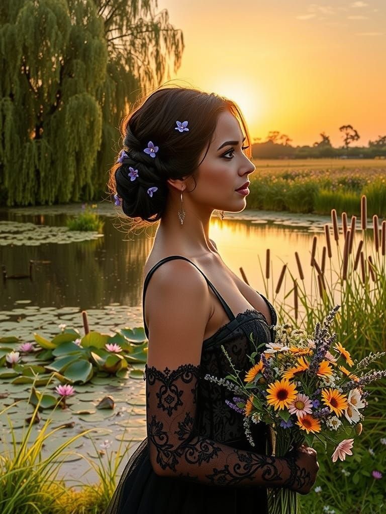 This image shows a woman with dark skin and hair adorned with purple flowers, wearing a lace corset and opera gloves. She holds a wildflower bouquet by a pond at sunset, bathed in golden light.