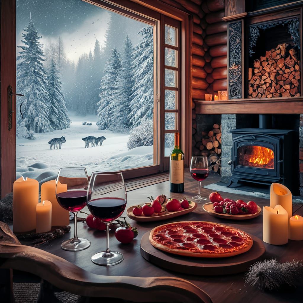This image shows a warm cabin interior with a dining table and fireplace, viewed through a glass door. Outside, a blizzard rages in a pine forest with three wolves visible. Photographed with soft lighting and shallow depth of field.