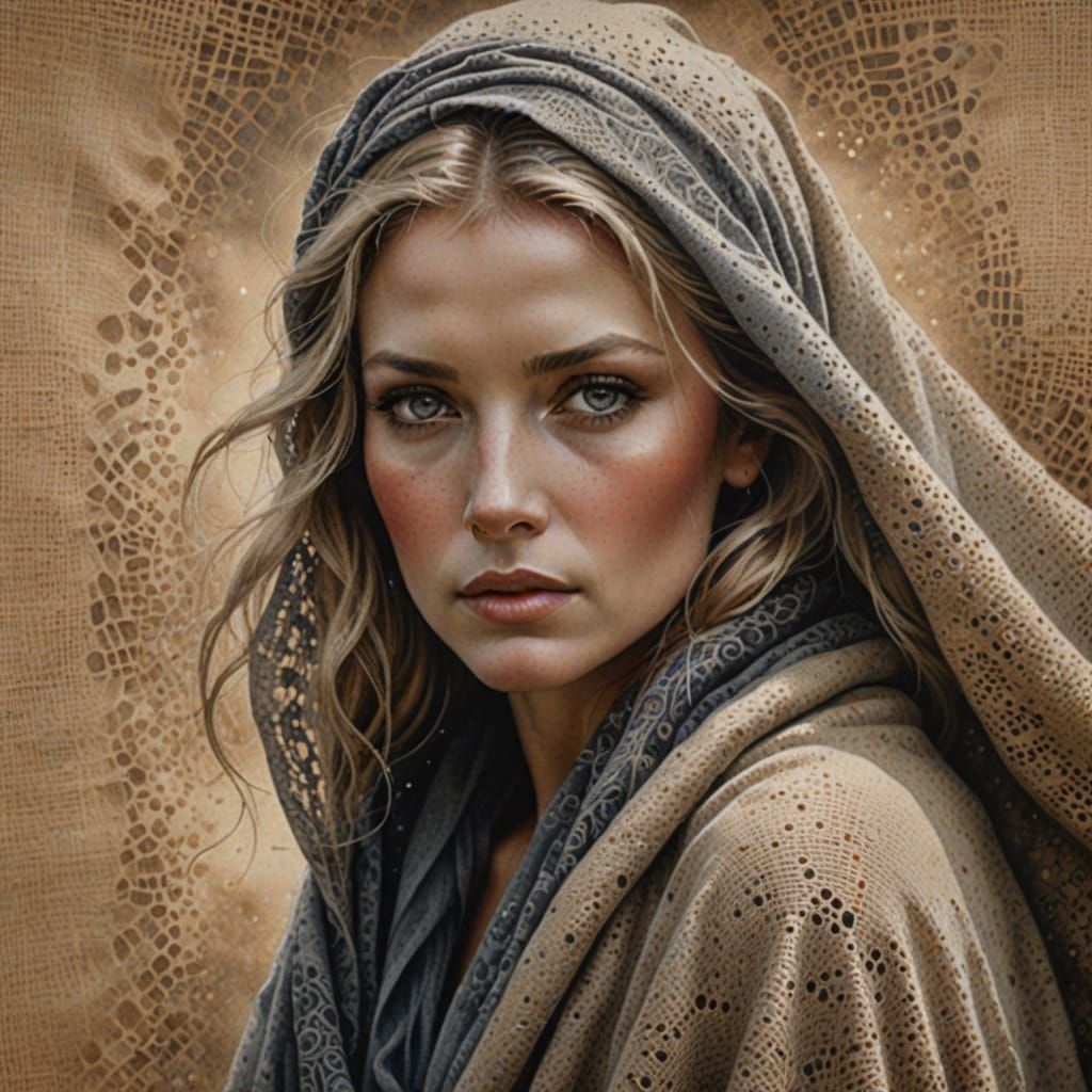 A striking portrait of a blonde woman draped in a shawl, rendered with pointillism techniques. The artwork evokes a sense of mystery using charcoal, pencil, and watercolor on a burlap canvas.