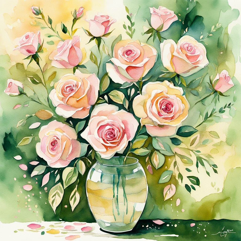 A close-up watercolor painting of pink roses in a vase, showcasing delicate textures and soft green leaves. The image employs whimsical brush strokes and a warm, pastel color palette, rendered as abstract expressionism.