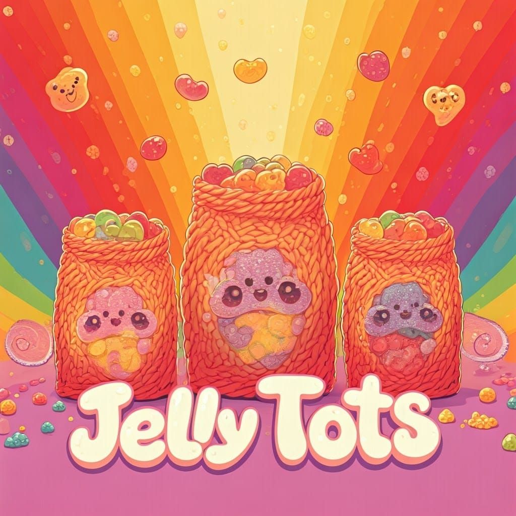 This image shows colorful, fruit-flavored Jelly Tots spilling from magical packets. The scene features chibi-style details against a vibrant backdrop, reminiscent of Japanese kawaii art with rounded shapes.
