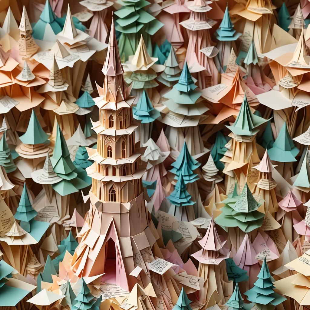 A detailed papercraft of Sauron's tower made from origami folds. The image showcases a close-up of the delicate paper layers with warm light shining through, in pastel colors and high contrast.