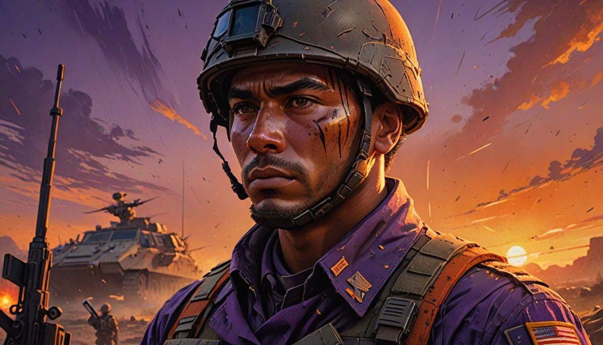 A striking picture of a soldier watching a sunset. The close-up, mid-shot image renders the scene in vibrant colors and high contrast, with dramatic side lighting and splash art style.
