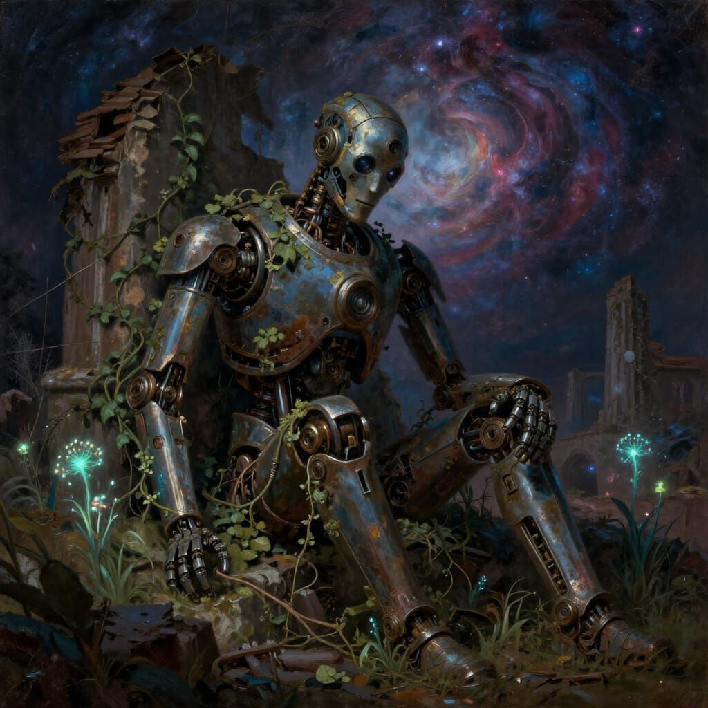 This image shows a weathered automaton in overgrown ruins, illuminated by glowing flora under a cosmic sky. Rendered in a painterly style with deep textures and dramatic lighting.