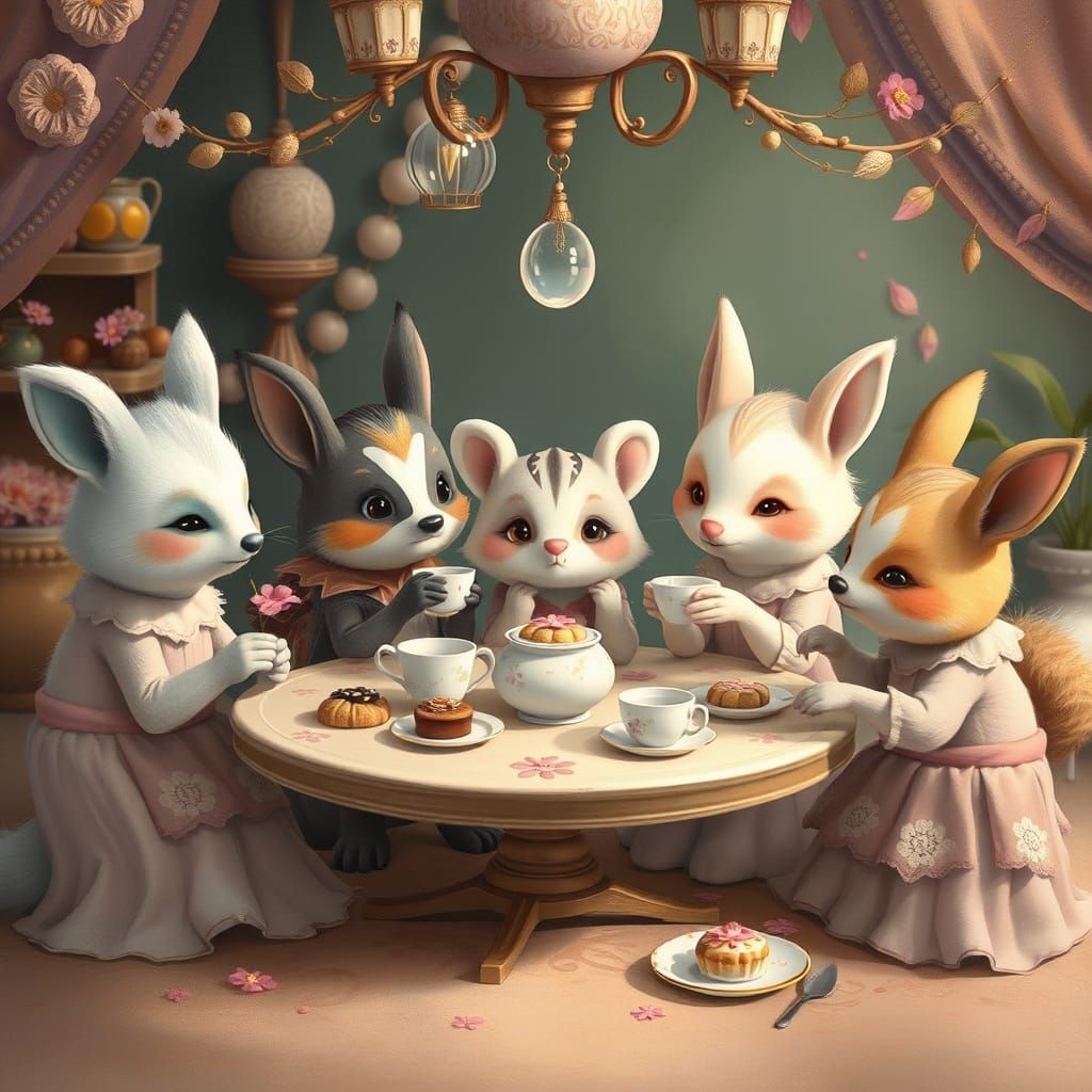 This image shows a whimsical tea party with cartoon animals in pastel clothing. The scene blends dark, mystical elements with vibrant, fantastical touches in a dreamy, ethereal style.