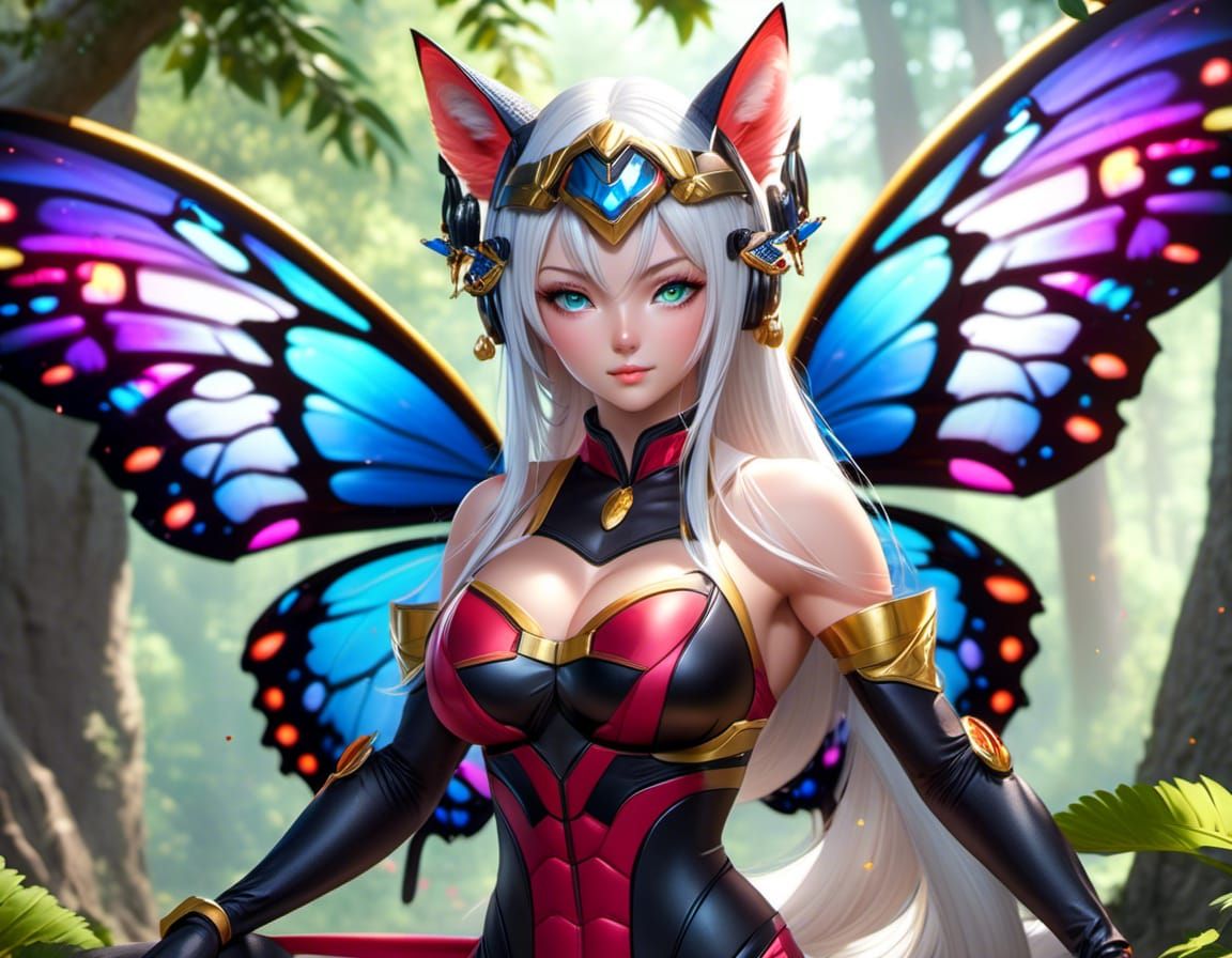 This image shows a striking, high-resolution portrait of a butterfly woman with fox ears and long white hair. She flies through a forest with large trees and vibrant colored wings.