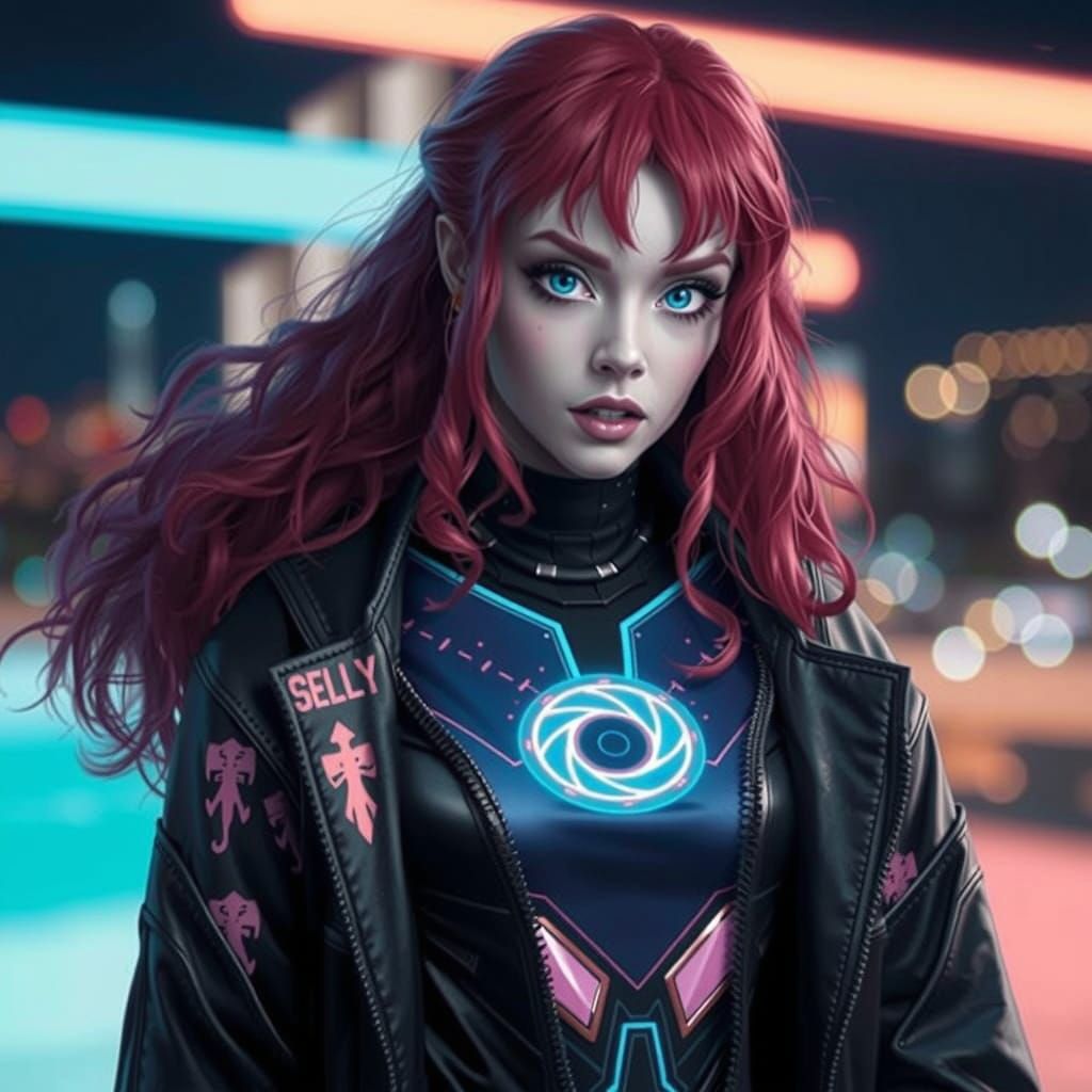 This image is a futuristic, neon-lit depiction of a vampire character with an elegant, curvy figure, set against a vibrant, cyberpunk beach scene, with fae wings and striking, galaxy-blue eyes.