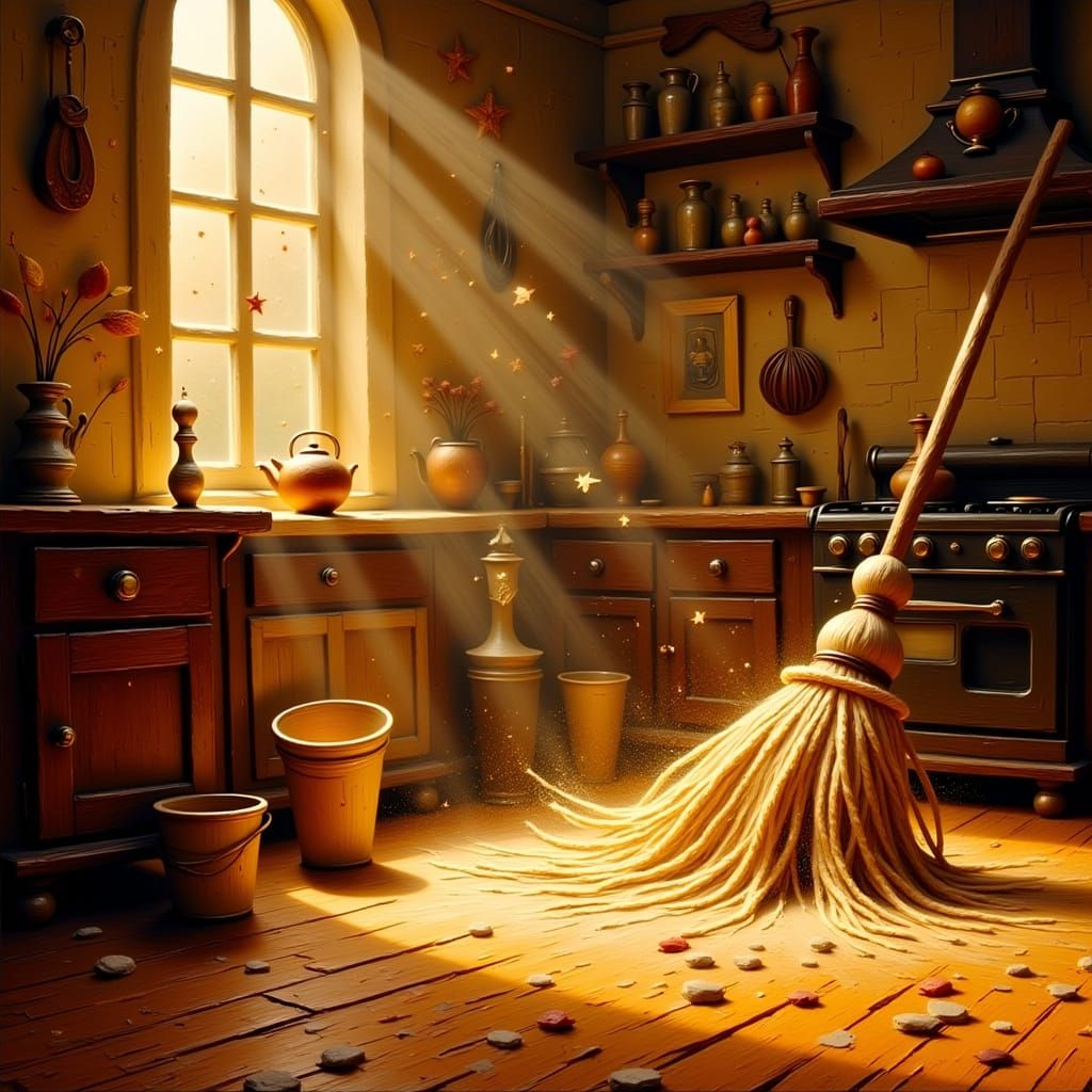A lively enchanted scene of a magical broom sweeping a cottage floor on its own, bristles gliding gracefully as dust sparkles in the air. Buckets float nearby, pouring soapy water that dances across the floor like liquid light. The broom moves with rhythm and personality, as if joyfully performing a ...