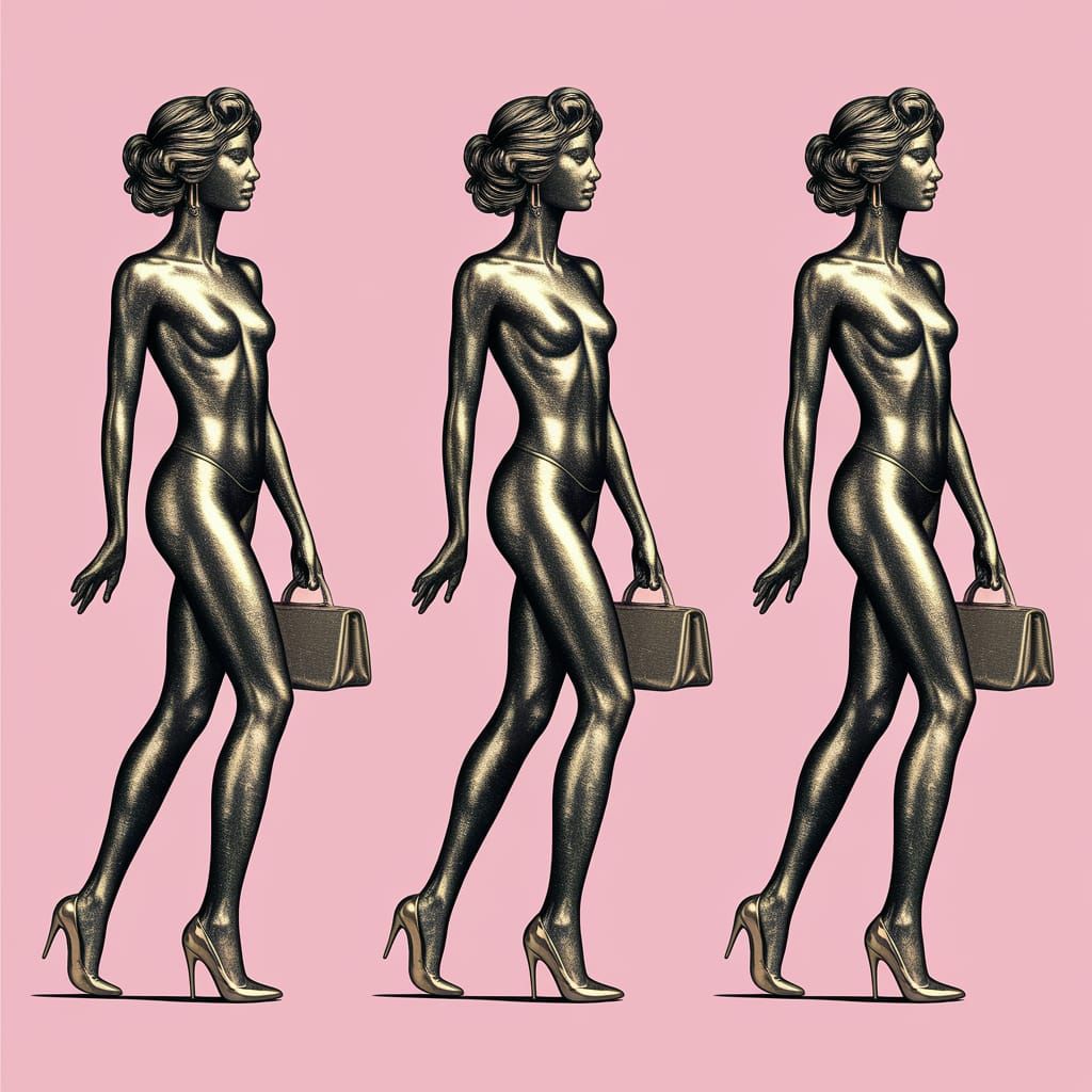 This image showcases a full-bodied golden girl with legs in heels, rendered in a narrow and sleek vector graphic style. The artwork features minimalist line drawing techniques and a modern aesthetic.
