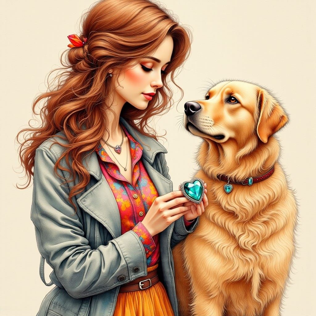 This image depicts a young woman with chestnut brown hair and a warm smile, surrounded by the atmosphere of an animal rescue shelter, as she prepares to adopt a golden retriever-labrador mix, rendered in the style of vibrant, expressive ink drawings reminiscent of Matisse and Mucha.